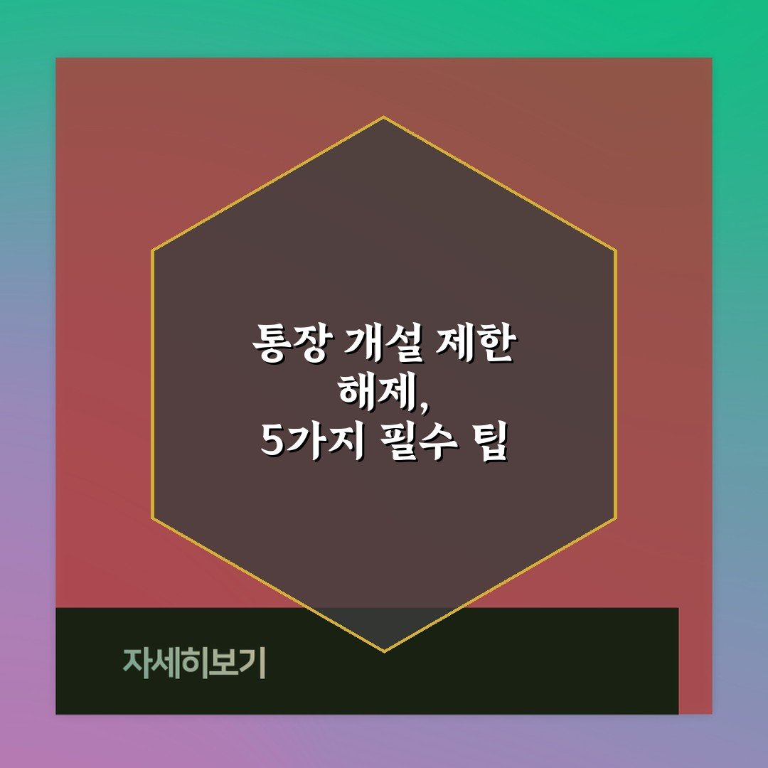 통장 개설 제한 해제, 5가지 필수 팁 총정리 2026년 03월 09일 작성자: 인포 “통장 개설 제한 해제를 위한 5가지 필수 팁을 확인하세요! 쉽고 빠르게 계좌를 개설하는 방법을 알아보세요.”